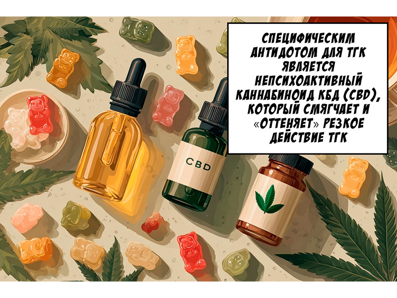 Если же это не помогло, стоит применить «антидот». Дискомфорт вызывается резким поступлением в организм высоких доз ТГК, обладающего психоактивностью и стимулирующим действием на ЦНС. Специфическим антидотом для ТГК является непсихоактивный каннабиноид КБД, которые смягчает и «оттеняет» резкое действие ТГК, обладая также медицинским потенциалом.